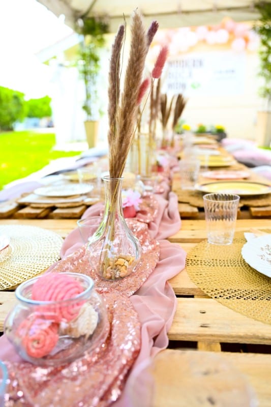 To get started, I layered two table runners in two different styles from Amazon (3 sequin rose gold and 3 chiffon dusty rose) one on top of the other along the entire center area of the shipping pallets. It looks better if it’s a little messy/draped.